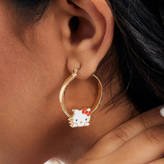 Hello Kitty Womens Hoop Earrings- Plated Gold and Enamel Hello Kitty Earrings- Hello Kitty Jewelry