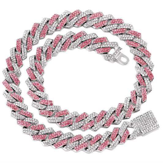 Pink Iced Out Chains 2Row Rhinestones Cuban Link Chain Necklace for Women Bling Miami Prong Cuban Choker Hip Hop Fashion Jewelry